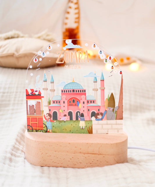 Tauche ein in die faszinierende Atmosphäre von Istanbul und der Ayasofya-Moschee mit unserer personalisierten islamischen Nachtlampe für Kinder! Begleite deine Kleinen auf eine inspirierende Reise durch die beeindruckende Stadt und die bedeutungsvolle Ayasofya-Moschee.